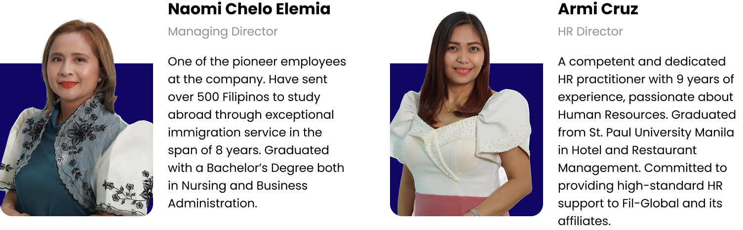 Managing DirectorOne of the pioneer employees at the company. Have sent over 500 Filipinos to study abroad through exceptional immigration service in the span of 8 years. Graduated with a Bachelor’s Degree both in Nursing and Business Administration.